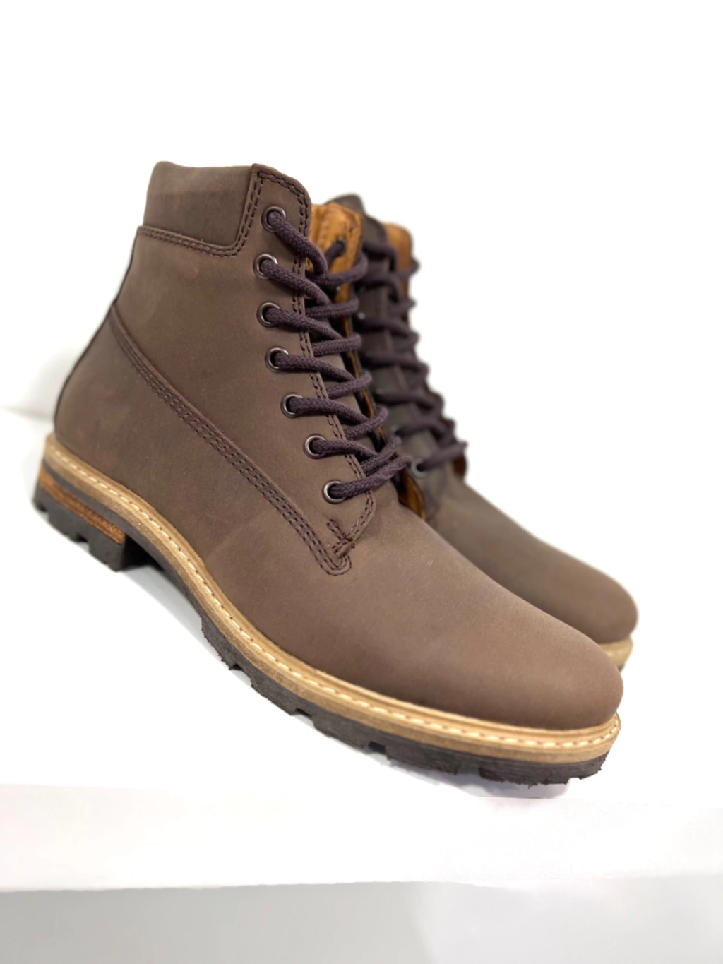- Borcego acordonado confeccionado con cuero engrasado, forrado con cuero