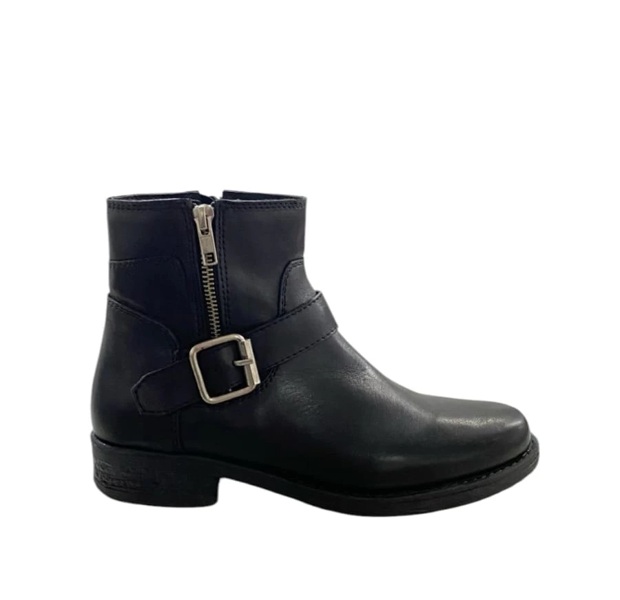-Bota de cuero punta redonda, con detalle de cierre y cinto con hebilla
