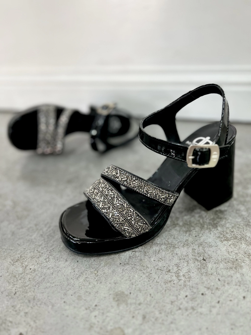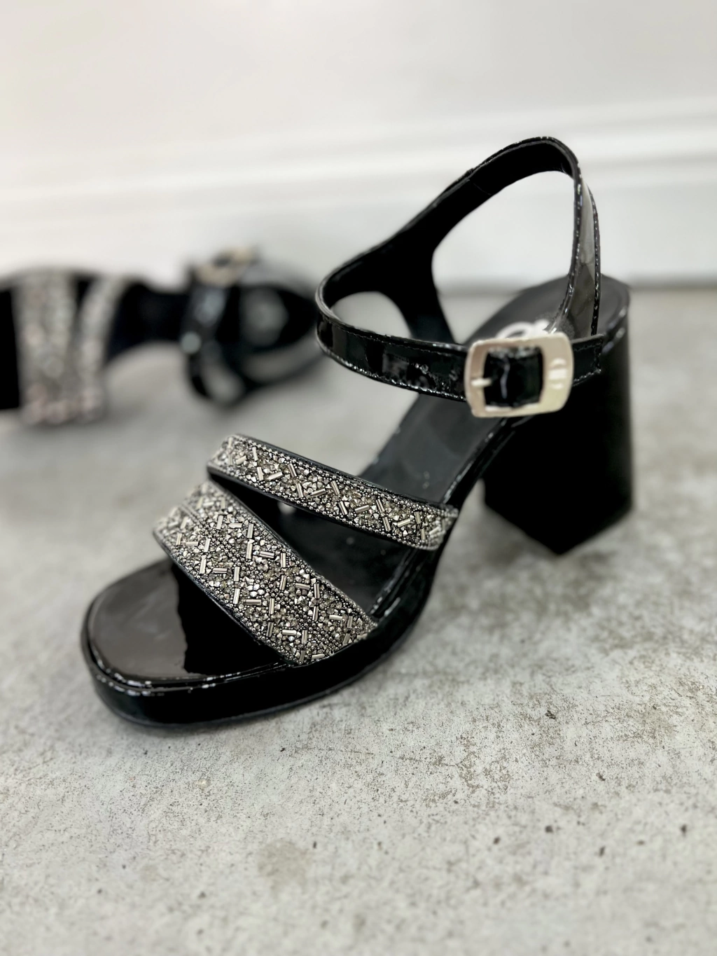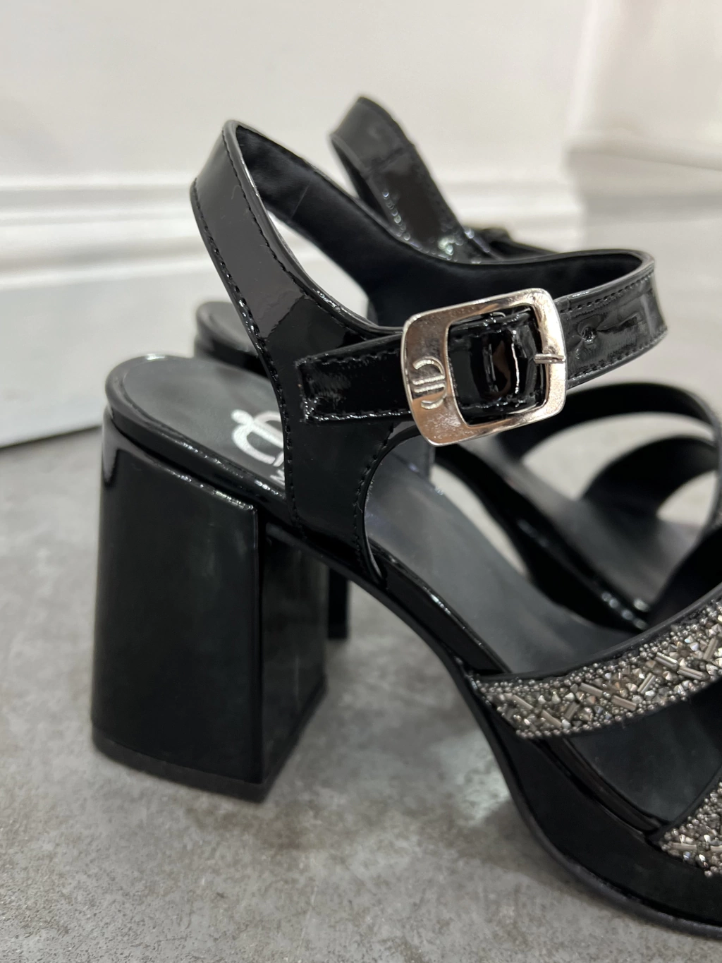 - Sandalia charol con pulsera y hebilla, tiras cruzadas en empeine con strass y canutillos.