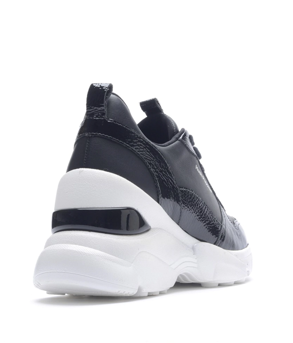 -Zapatilla confeccionadas en cuero con recortes en charol.
