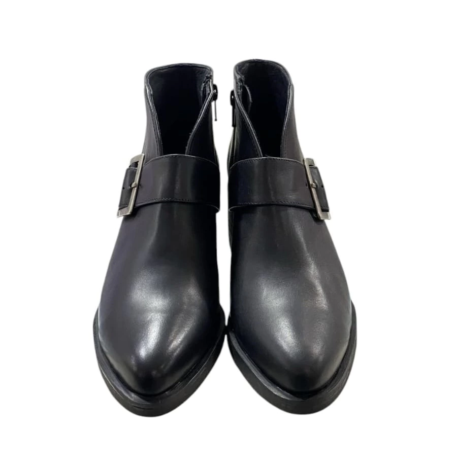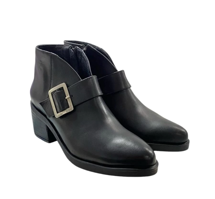 -  bota estilo texana con detalle de cinto y hebilla de cuero forrada en cuero y cierre lateral