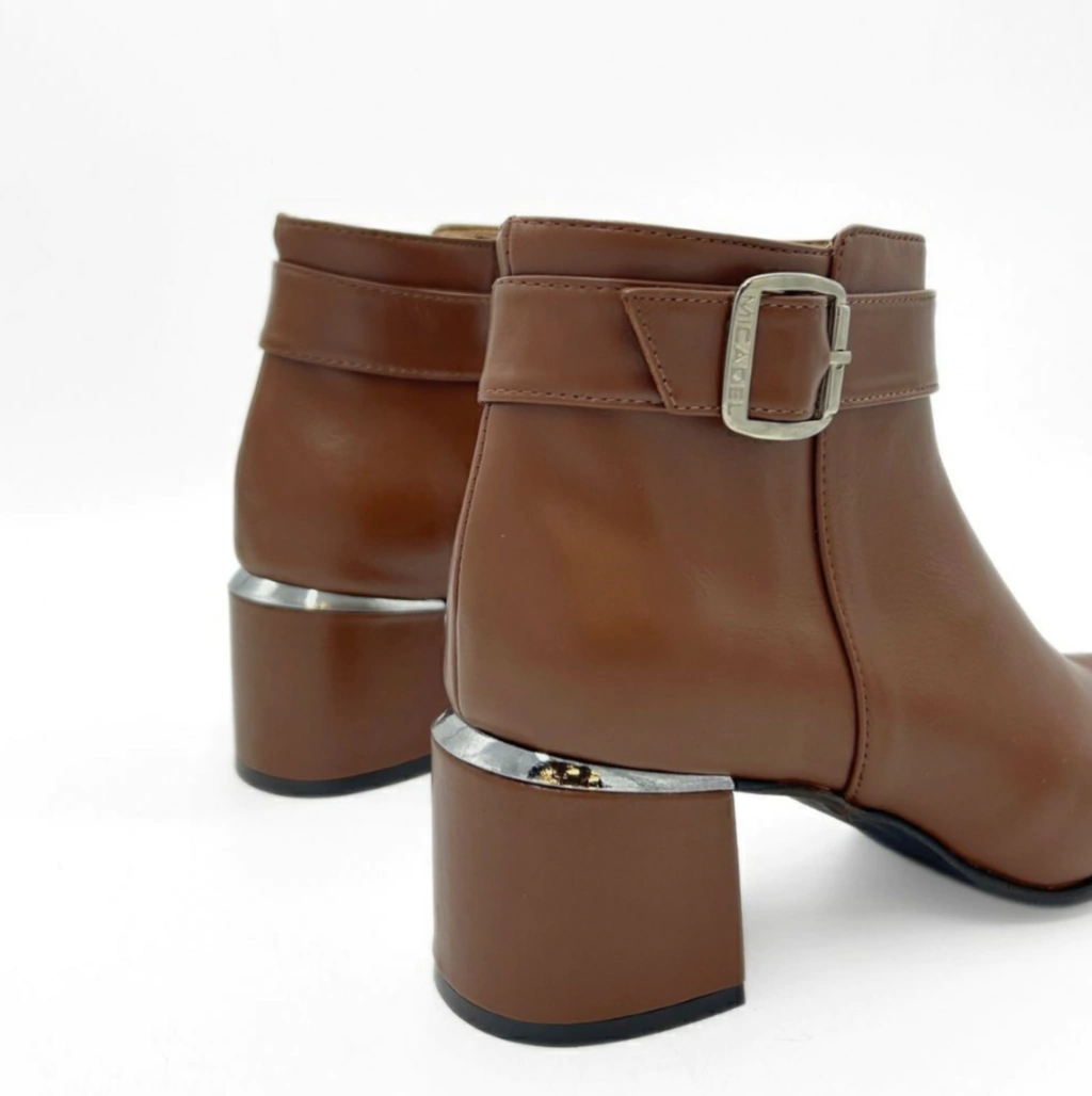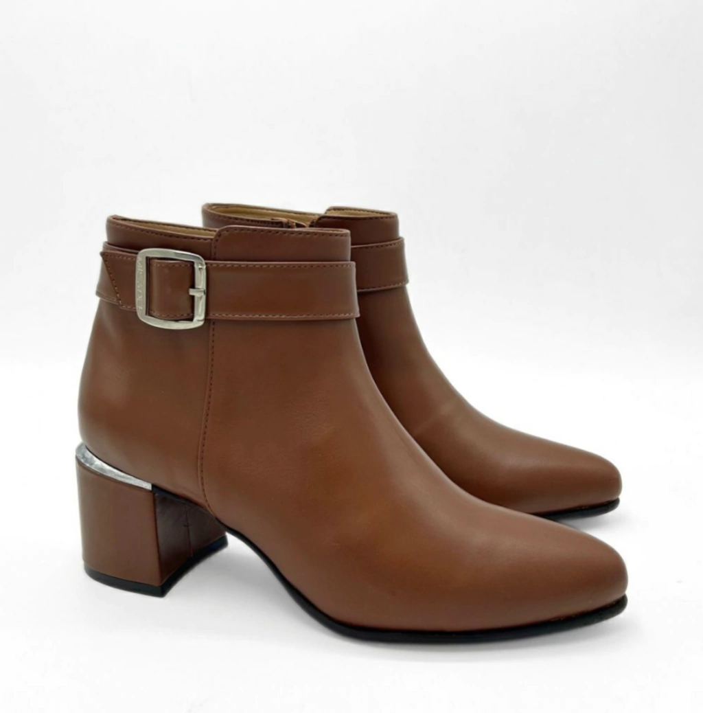 - bota caña corta, confeccionada en cuero con lazo y hebilla en lateral, cierre interno y taco cuadrado.