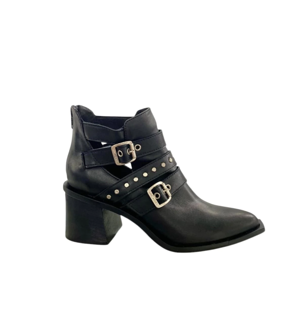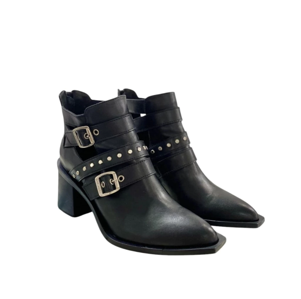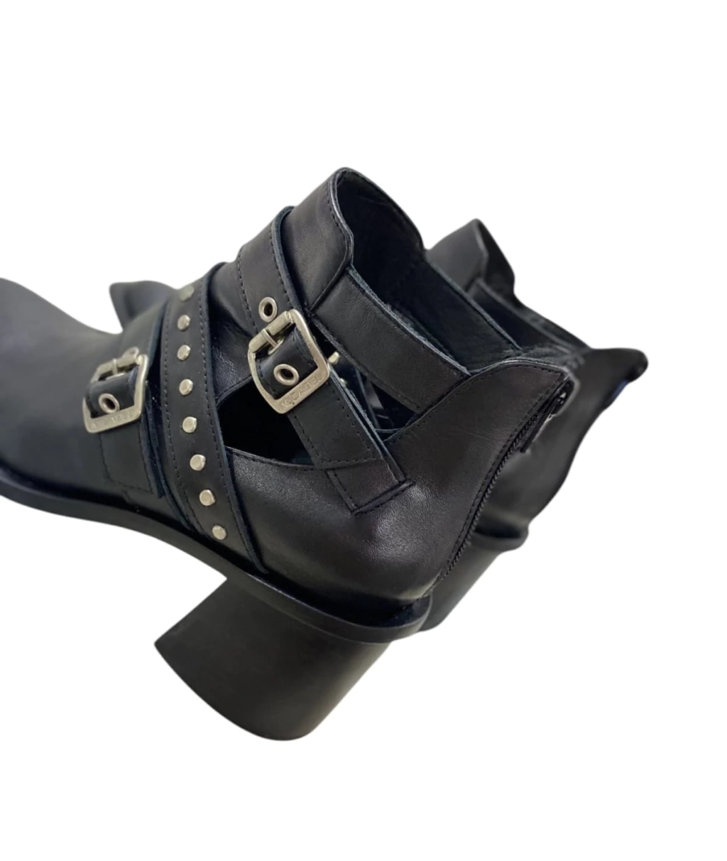 - Texana de cuero con abertura y detalles de cinto con hebillas y tachas